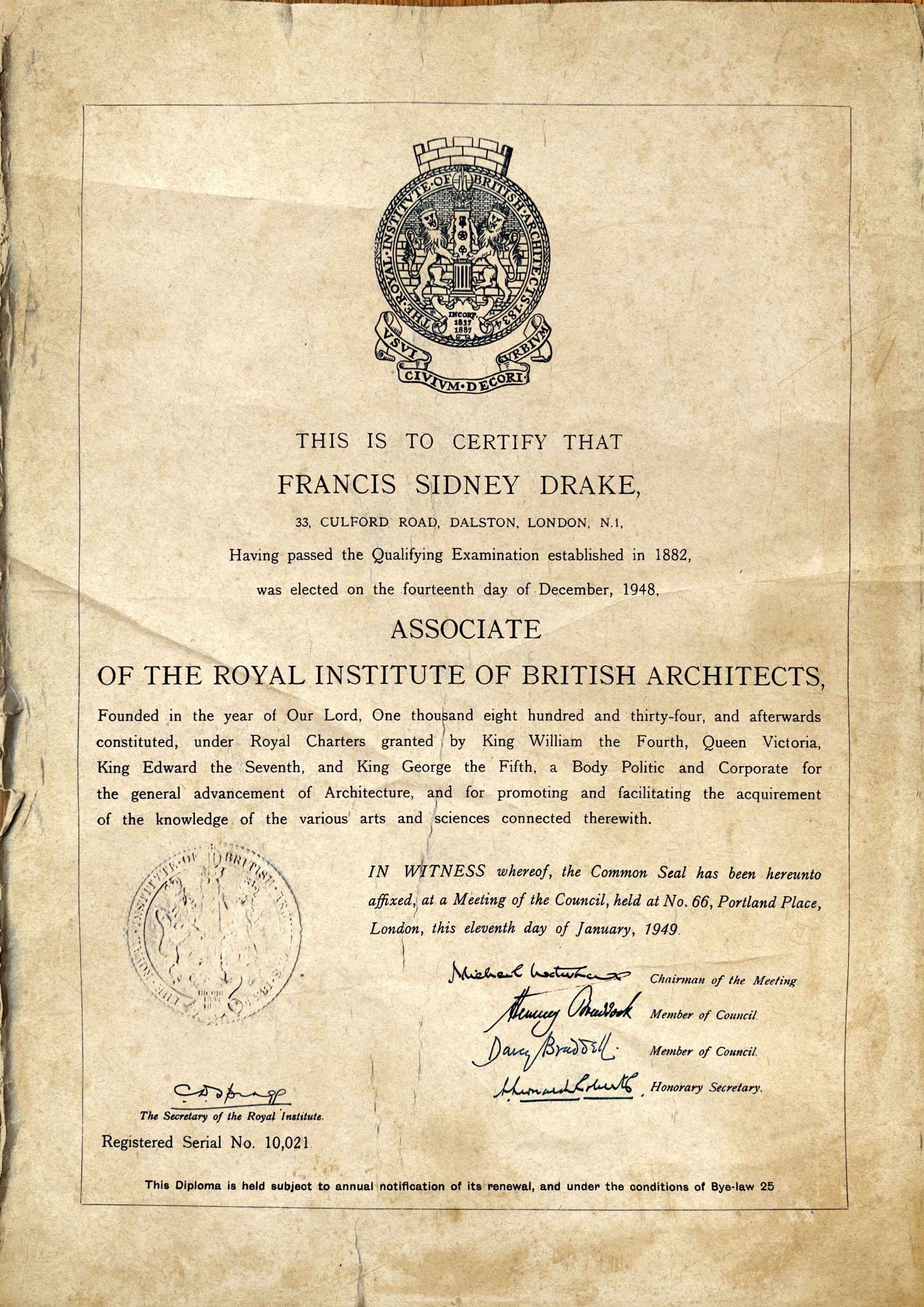 Certificate for Francis Sidney Drake's election as an Associate of the Royal Institute of British Architects