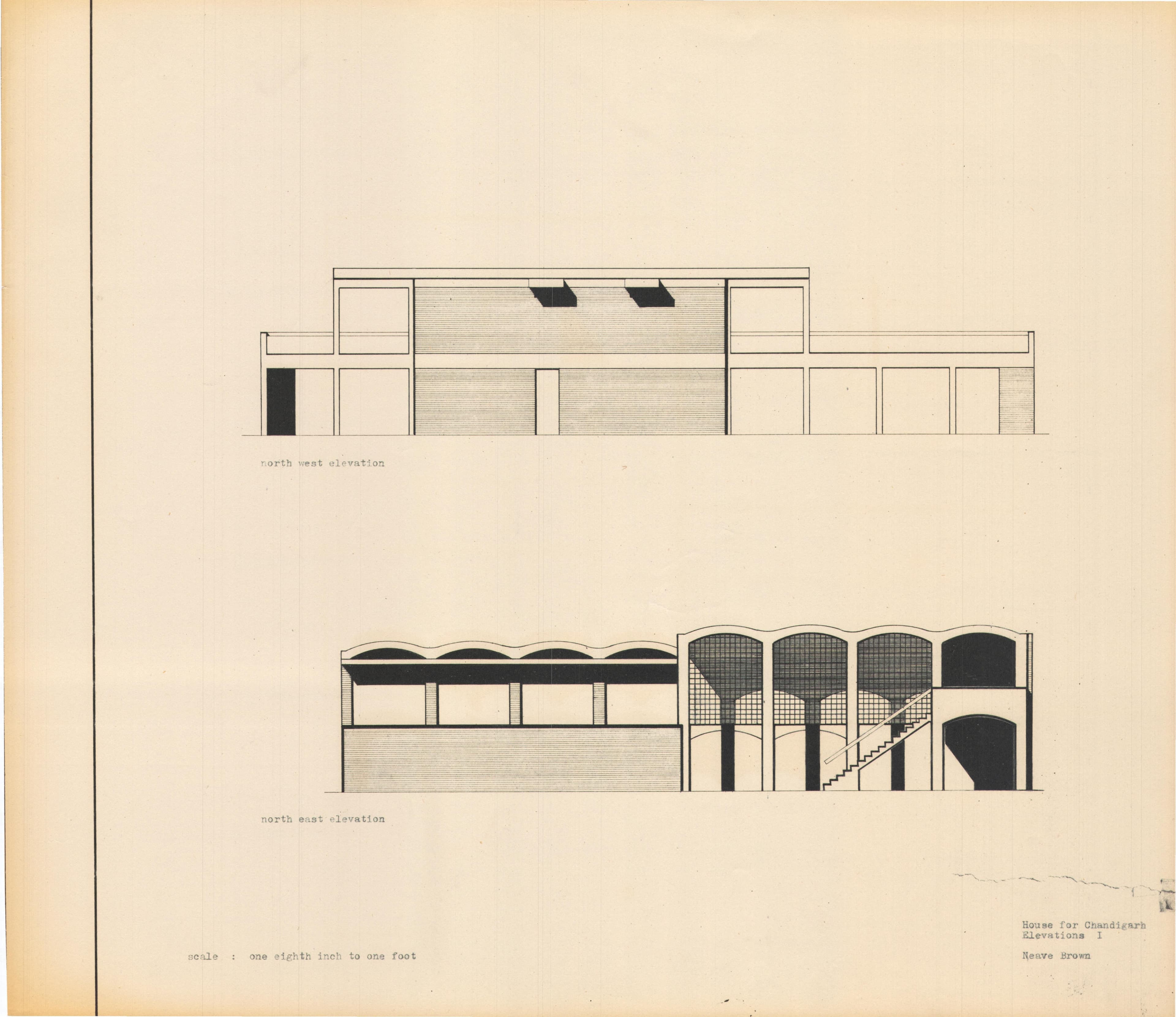 Neave Brown, 'House for Chandigarh, India: South-East and South-West Elevations', AA Department of Tropical Architecture, 1954-1955. AA Archives.
