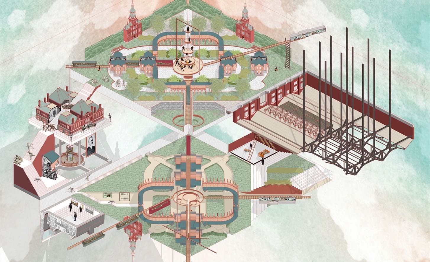 Brian Henderson Prize, is awarded annually in celebration of the artistry and vision of the hand-drawn architectural image. Set up in memory of Brian Henderson, who was instrumental in establishing the Architectural Association Foundation in 1989. This year the prize was won by Qi Zhu from Experimental 11 for the project 'Collage Sewage Garden'.