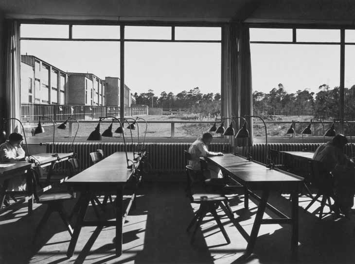 Image: View from the library of the ADGB School in Bernau by Hannes Meyer. Photo: Walter Peterhans, 1930, Bauhaus Dessau Foundation.