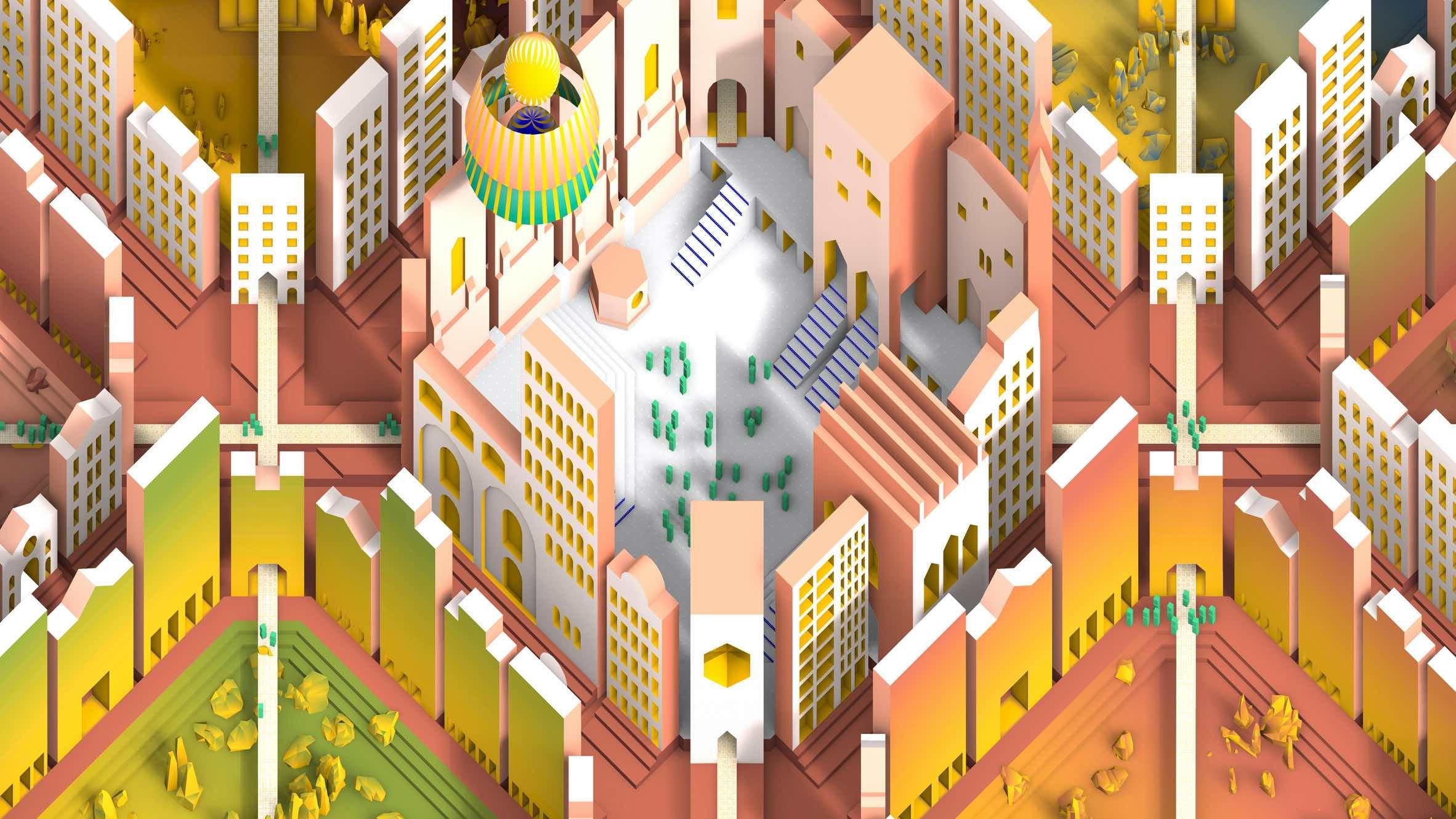 Dezeen featured Space Popular's interview for the Virtual Design Festival in their list of the top 10 architectural talks of 2020, in which the interview the pair discussed the endless possibilities of virtual reality. Dezeen also highlighted Punto de Inflexión as one of the best live events of the year, the first design conference to take place entirely in virtual reality. The virtual space for the conference, based on the street plan of Barcelona, was designed by Space Popular in their characteristically colourful style and enabled attendees to move around, network and flexibly communicate with each other over the course of the event.