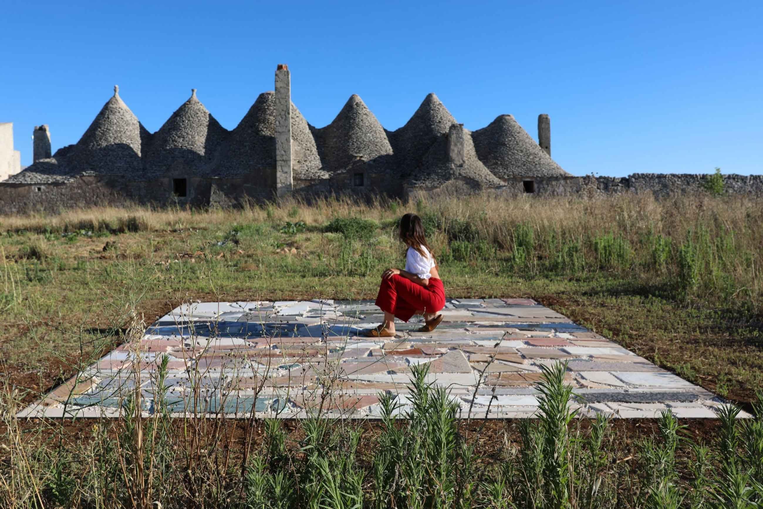 The project reuses marble waste from various refineries in neighbouring villages composing a 4x4m platform in the field which will be encircled by vegetables in a year's time.