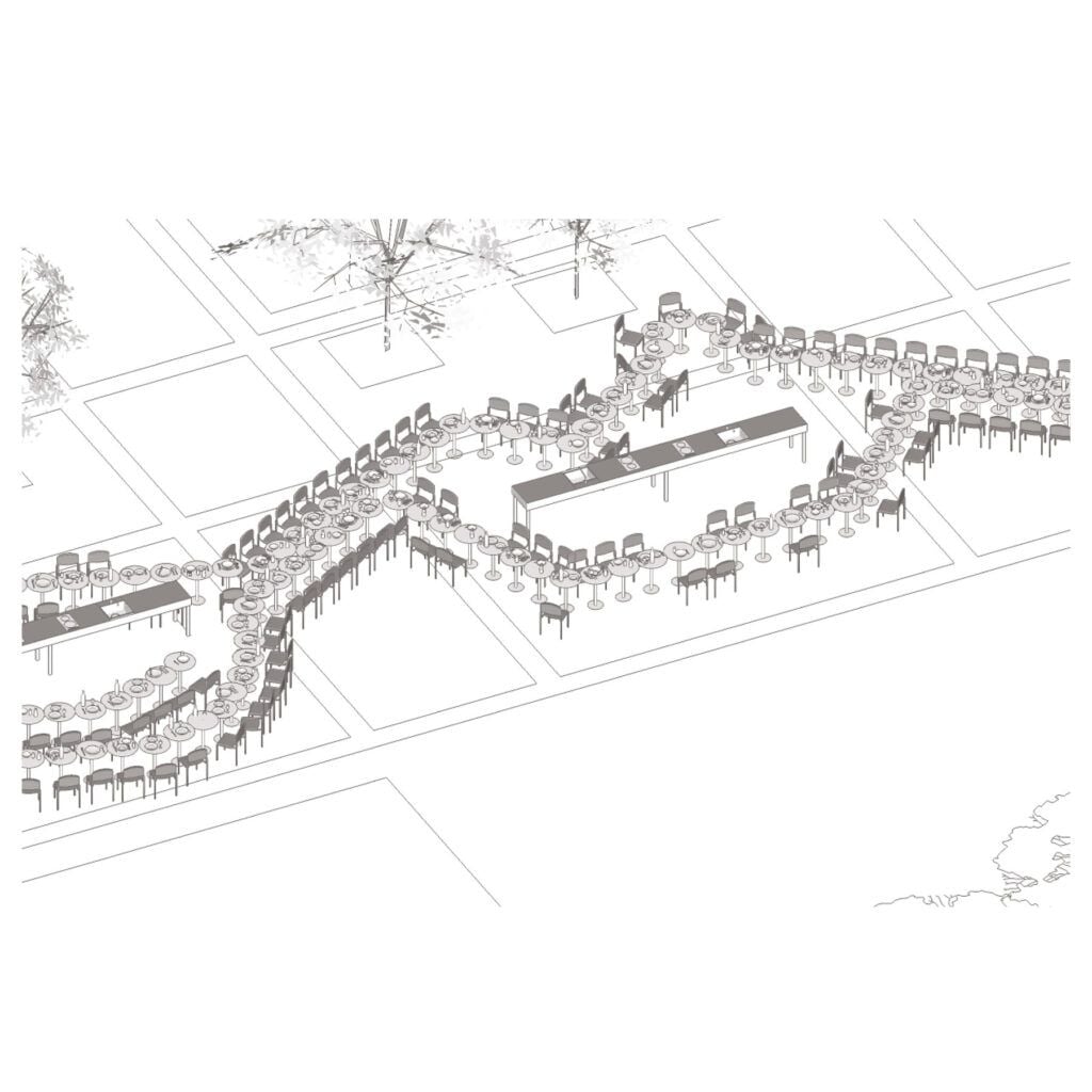 ‘The project reveals how everyday rituals such as dining are embedded in everyday objects such as furniture. The project creates a temporary performative space; the tables and chairs are props for the act of dining to take place; the performance reveals diversity and knowledge. The conscious decision to design individual tables which together create a whole explores form and its role in creating an inclusive environment.’