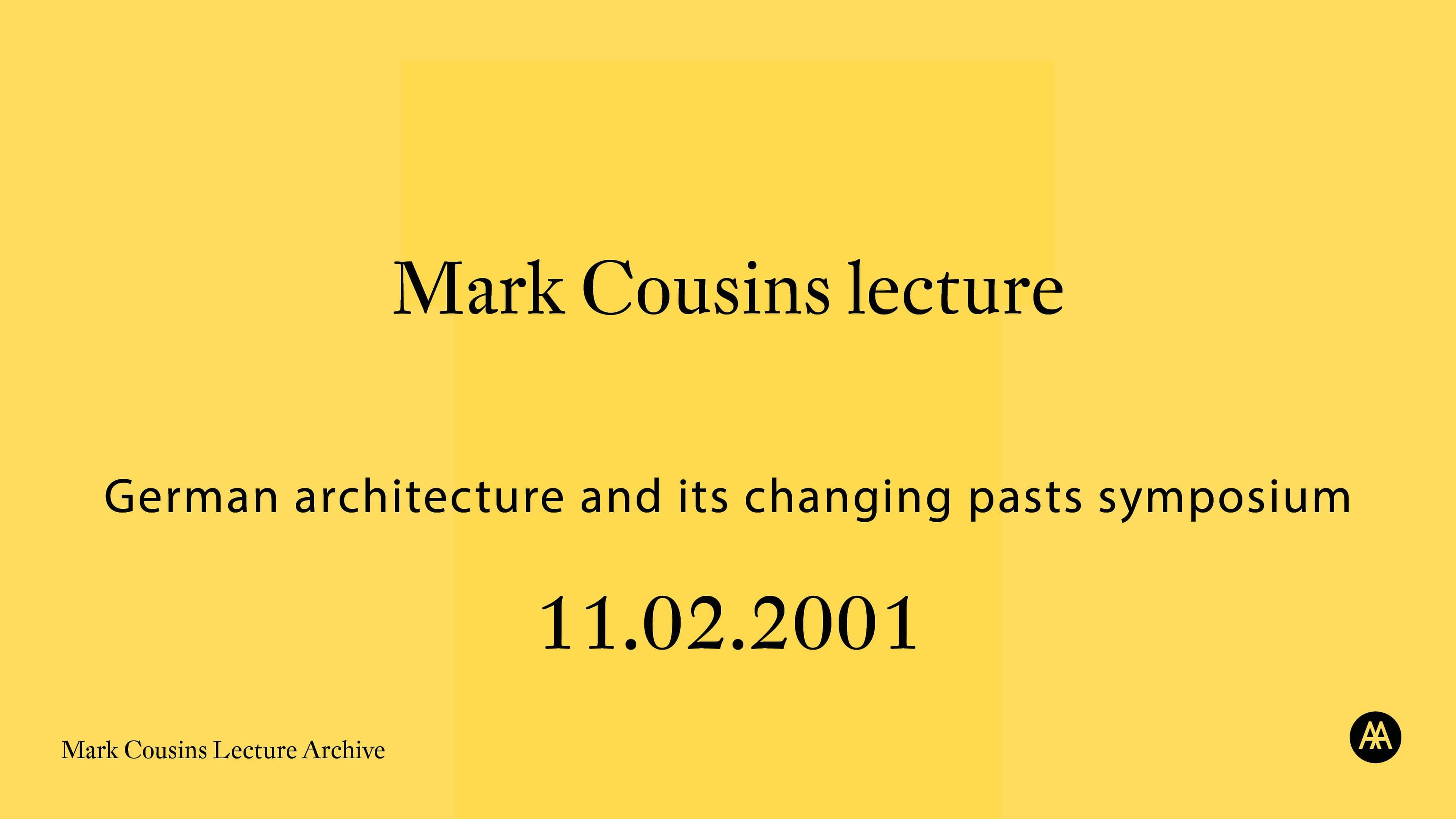 Comprises video recording of an untitled paper', given by Mark Cousins on the 11th February, 2001, as part of the 'German Architecture and its Changing Pasts' conference organised by the AA. The conference took place in the Main Lecture Hall, Bedford Square. The recordings consist of a digital preservation copy (366 MB, .MPG format) and a digital access copy (202MB, .MP4 format).