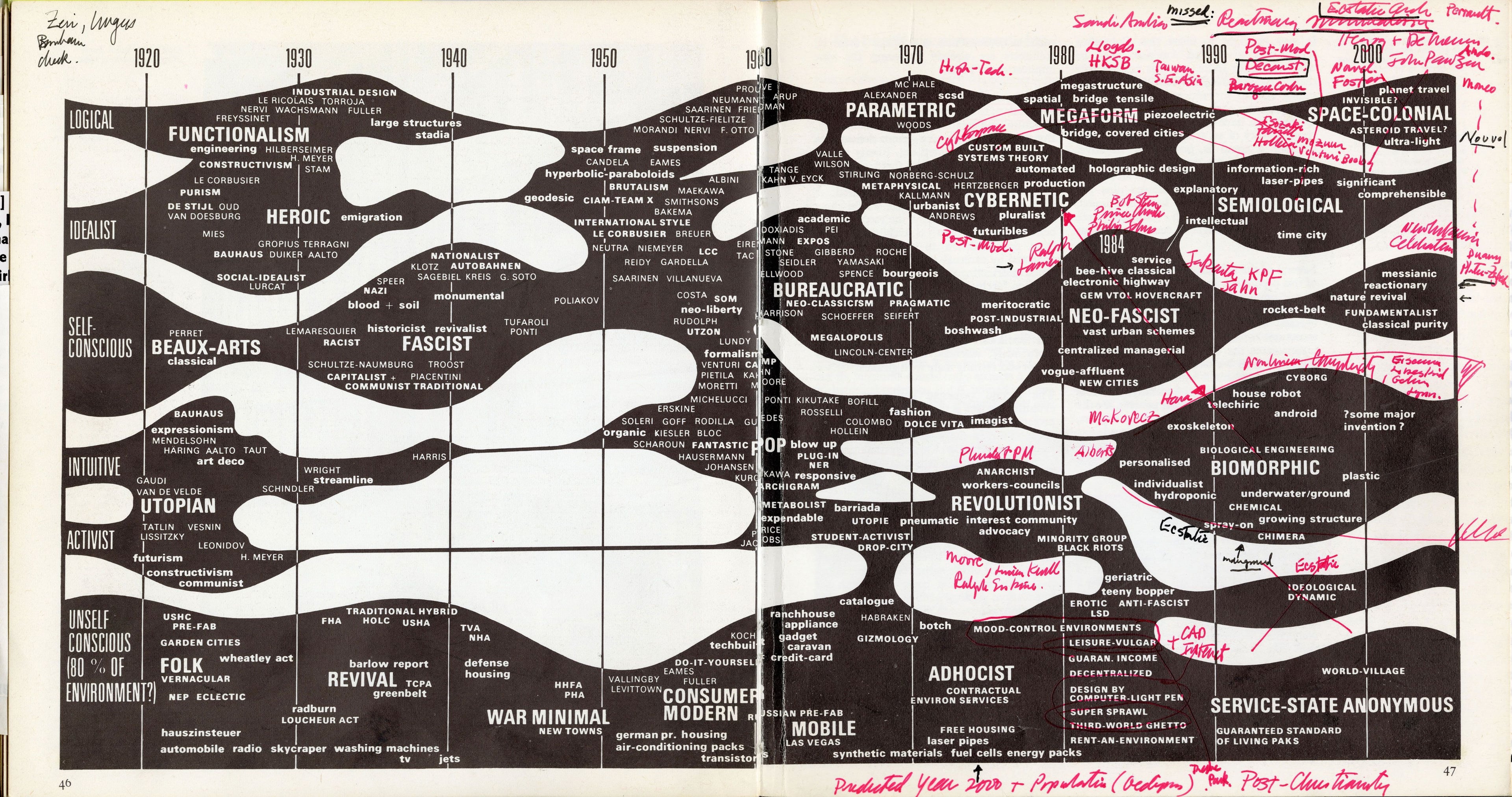 Chronograms of Architecture takes its starting point from Charles Jencks’ iconic Evolutionary Tree diagrams tracing architecture and society’s pulsations between different ideals through time. Beyond visualising and classifying architectural styles and traditions, Jencks’ ever-evolving diagrams provided a visual tool to analyse, understand, and represent dynamic relations between architecture and society as they unfold.