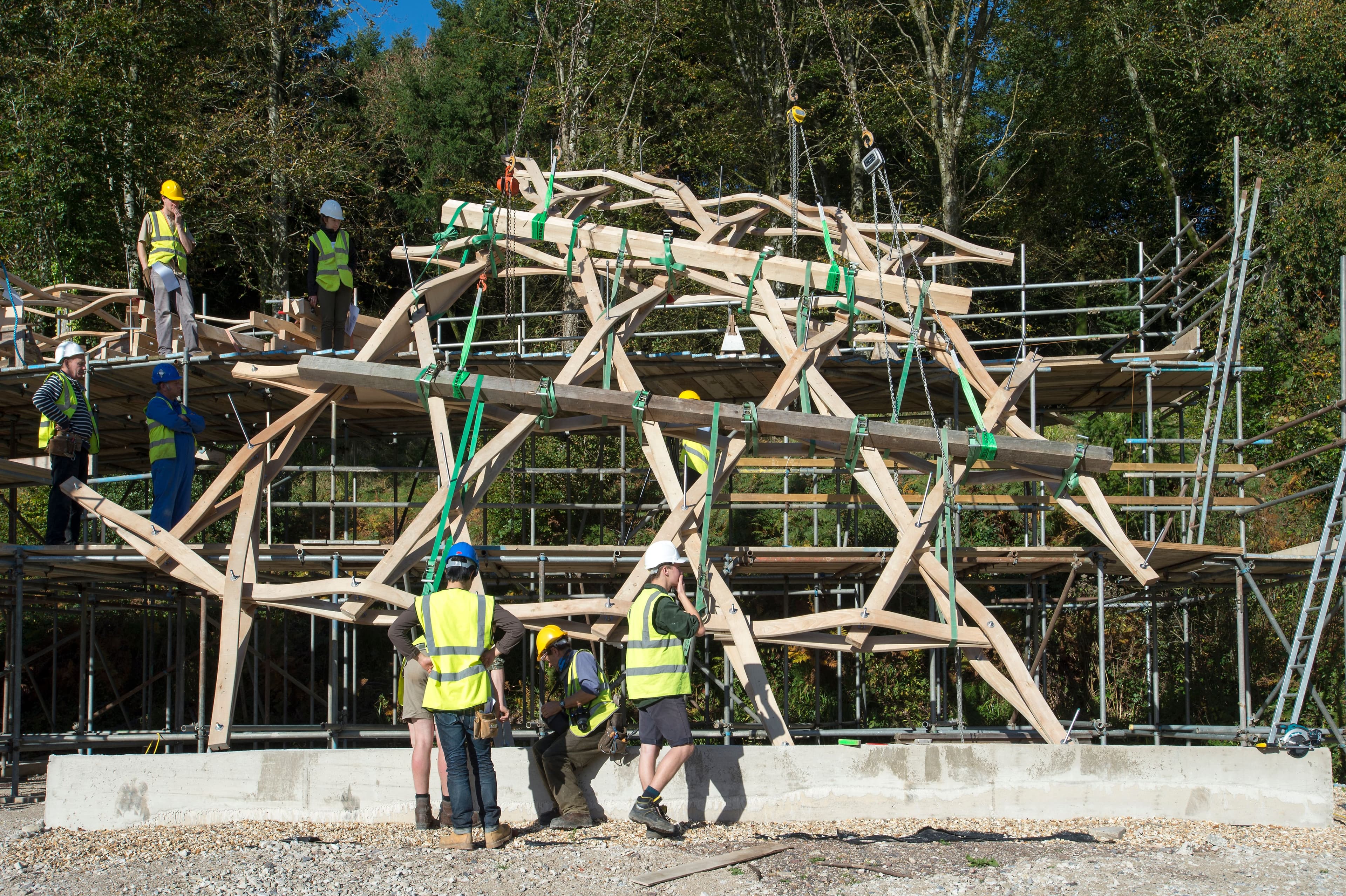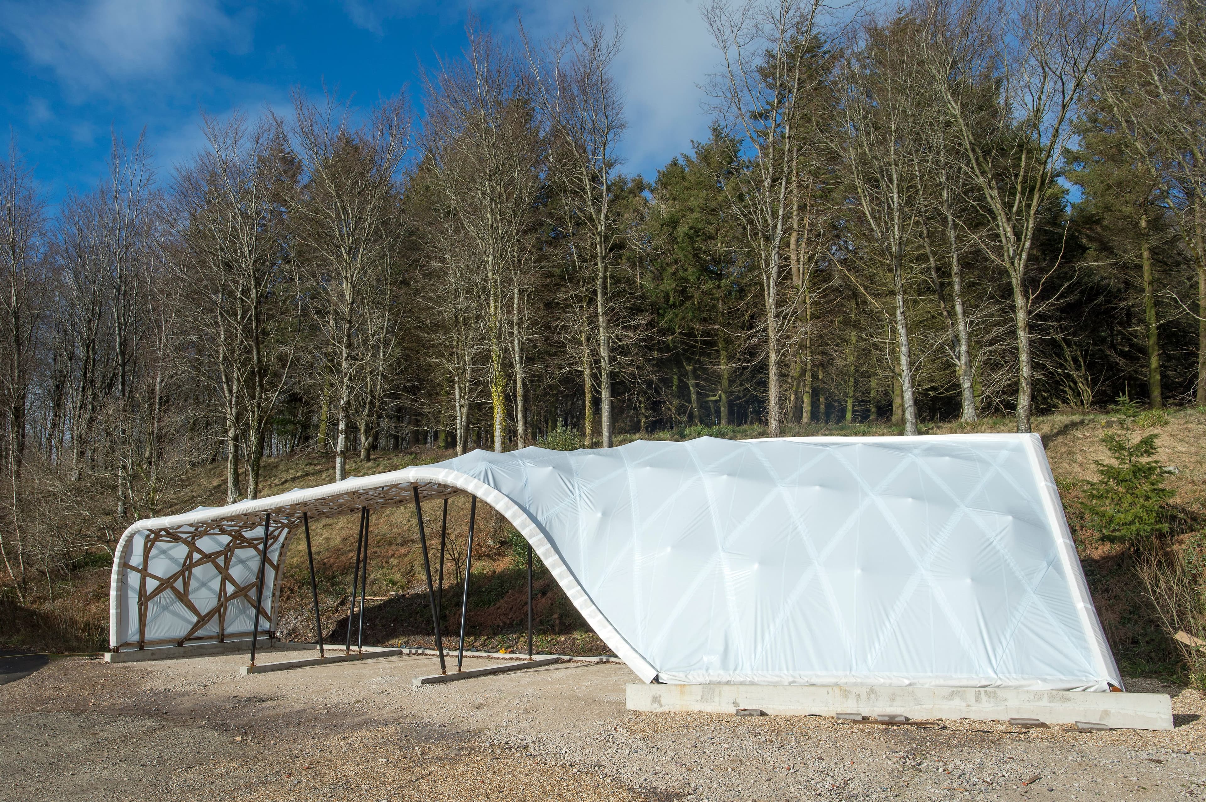 The Timber Seasoning Shelter provides a canopy for air-drying timber felled from the surrounding woodland, to use in student-designed buildings on site. Built from timber harvested from Hooke Park’s beech trees, the project was created by Design and Make students to test the innovative use of steam-bent timber elements in a reciprocal grid structure.